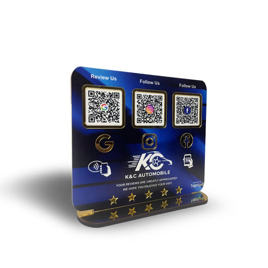 NFC cards/Standee work by storing a URL that links to your Contact Information, Google My Business Profile, Social Media Profiles etc.
