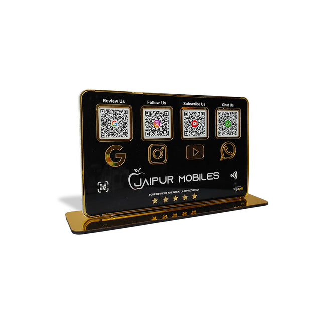 NFC cards/Standee work by storing a URL that links to your Contact Information, Google My Business Profile, Social Media Profiles etc.
